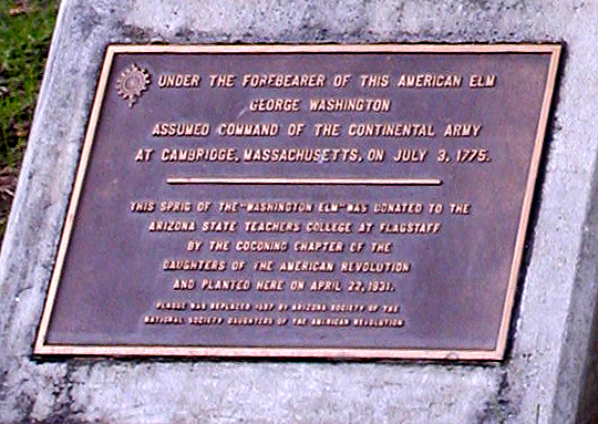 A sprig of the very tree under which Washington assumed command is planted on the campus of the Arizona State Teachers College at Flagstaff, now known as Northern Arizona University.