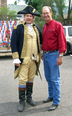 sharply down San Francisco Street. Leading them is General George Washington,
