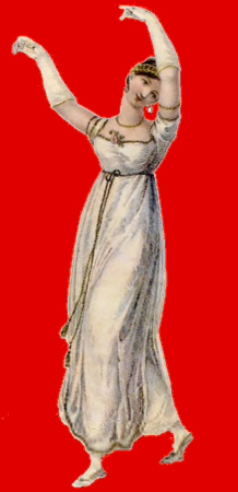 The ladies dress of the time was a long, draping, usually light colored,